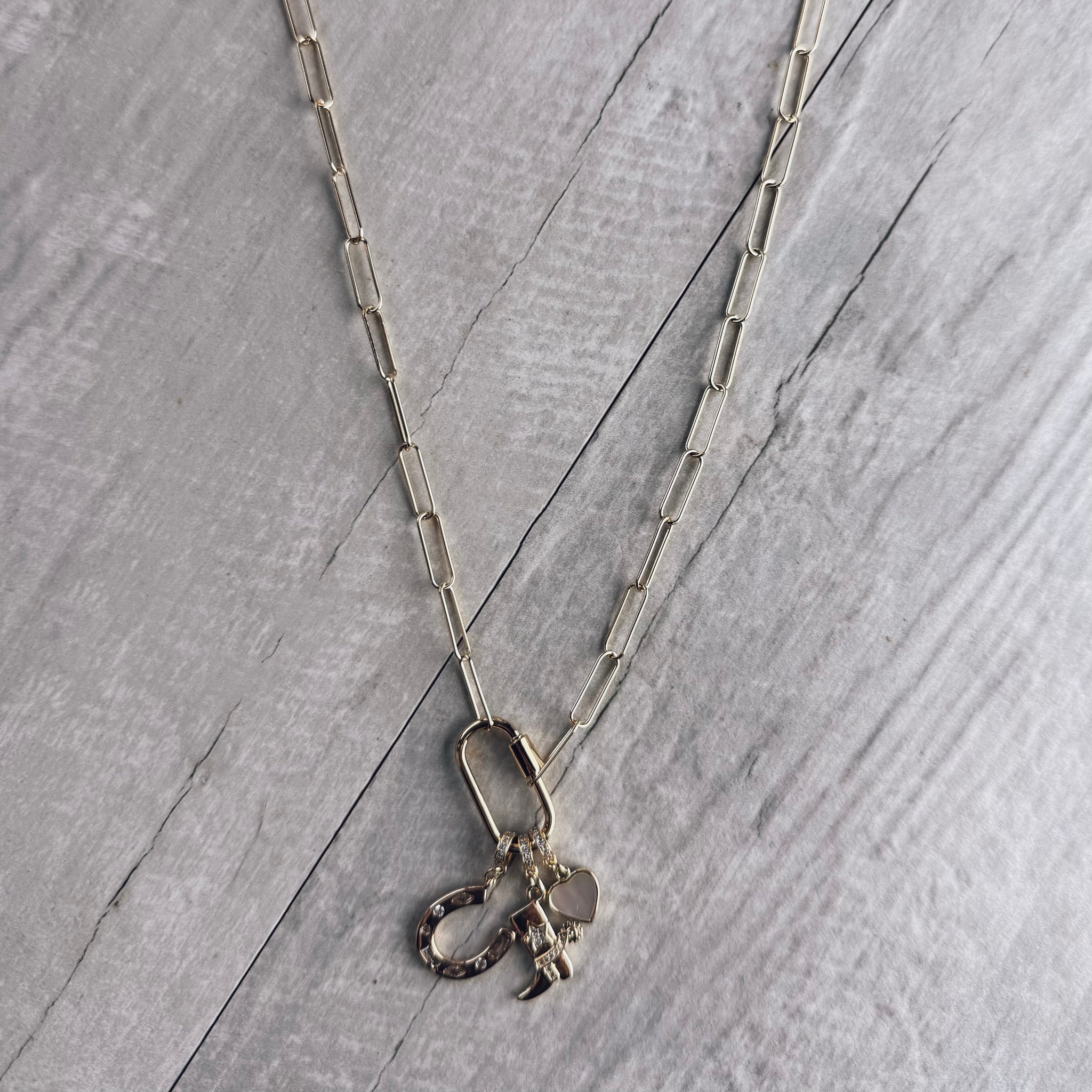 This gold-plated beauty features a dainty link chain adorned with three whimsical charms — including a golden horseshoe for good fortune. Playful yet polished, it’s the perfect piece for layering or wearing solo when you want to add a hint of shine and personality. The Lucky Necklace is gold plated stainless steel chain, gold plated over brass charms, nickel free with a 2” extension chain.